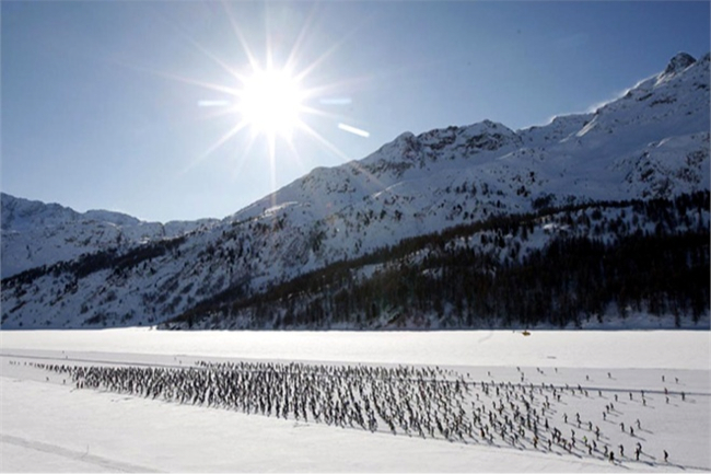 Cross country skiers race over the frozen lake Sils during the Engadin Ski Marathon near Sils March 14, 2010. More than 10,400 skiers participated in the 42.2 km race between Maloja and S-chanf near the Swiss mountain resort of St. Moritz. REUTERS/Christian Hartmann (SWITZERLAND – Tags: SPORT SKIING SOCIETY IMAGES OF THE DAY)